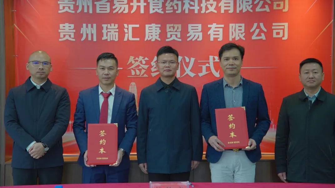 贵州省易升食药科技有限公司法人李文快(左二)与贵州瑞汇康贸易有限公司签订战略合作协议
